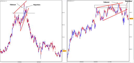 In #TataMotors, the 2024-2025 period saw a classic Bearish Rising Wedge formation. As the wedge tightened at the ₹620–₹700 range (demerger adjusted), we witnessed a final Blow-off Top (Fakeout), a move designed to trap breakout buyers before a sharp Rejection confirmed the trend reversal.